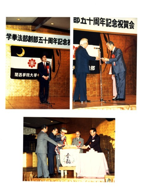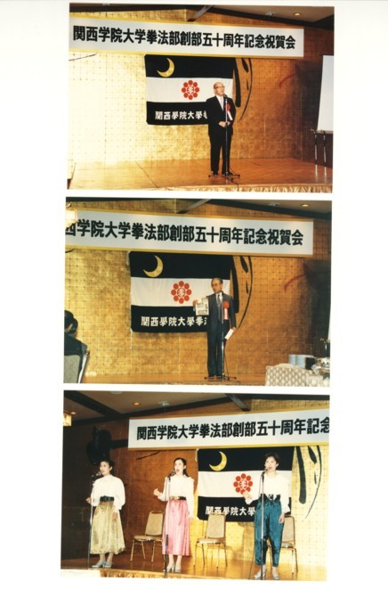 関西学院大学拳法部創部50周年を記念して、関学拳法部道場でのOB対現役の親善試合、 ならびに宝塚ホテルゴールドの間に於いて、関学拳法部創部50周年並びに増谷先生退職記念パーティー を開催しました。来賓約60名、OB約60名、現役約30名、合計約150名が参会しました。 和田OB会長の開会の辞に続き、故澤山宗家を偲んで、スライド「日本拳法50年の歩み」を上映、 日本拳法会矢野文雄会長、関西学院同窓会木村正春会長の来賓ご挨拶を戴いた後、約40年に亘って 拳法部部長を務めて戴いた関西学院大学名誉教授 増谷裕久先生に鷲尾OB会幹事長から記念品を 贈呈し、新任部長、梶浦昭友先生のご紹介、鏡開き、米田満先生による乾杯と式が進みました。 ご来賓、OBの歓談が弾む中、宝塚歌劇団によるアトラクションが花を添え、関西学院大学応援団指揮の下で、 校歌「空の翼」を合唱し、盛会の中、閉会致しました。