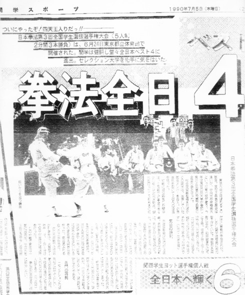 大金星を挙げたのが3回戦。気勢をあげる関学の前に、京産大が立ちはだかった。昨年全日本2位、今春 全関西2位の強敵である。当たって砕ける覚悟でした。苦戦は承知の上で各自が自分の役目を果たそうと 燃えていた」(経四・鎌田)優位とされる京産大に対し、関学は全くひけを取らなかった3人続けて引き分け とした後迎えた副将戦。ここで菅(商四)が主将の意地を見せた。胴から面の二段突きを決めてまず一本。 直後に鮮やかな足払いからそのまま押さえ突き胴を奪った。気迫あふれる会心の二本勝ちだ。次の大将戦 では岡本が引き分け、貴重な1勝を死守。1勝4分けで関学が激闘に終止符を打った。この一戦で気迫は 一気に最高潮。中京大を3勝2敗で下し準決勝へと躍り出た。だが全日本大会の壁はさすがに厚く、中央大 (優勝校)に鎌田が1勝したもののあえなく敗北。3位決定戦でも龍谷大に惜敗してしまった。結局関学は 全日本で4位入賞を果たし、関西では2位にランクされた。昨年の3回戦敗退からして、驚異的な躍進ぶり である。