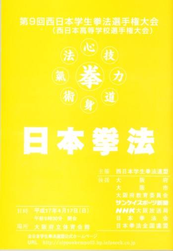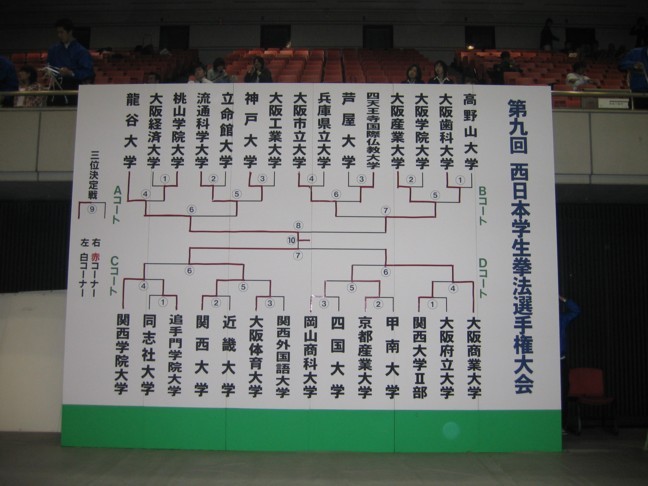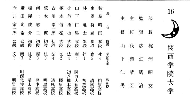 4月17日、大阪府立体育館で行われた7人メンバー勝ち抜き戦の本大会では、29大学が参加し、籤運に恵まれなかった関学は、 ベスト8に残るにとどまりました。大里、藤城が抜け、肩の脱臼跡をかばう秋葉、新人の林三段も足を骨折しての苦戦でした。 1回戦はシードされ、2回戦は同志社大に勝った追手門大に大将戦で勝ち、7対6で破りましたが、3回戦の関大戦では4対7で敗れました。 多数のOBが応援に駆けつけてくれました。 32年卒の川原先輩も病を押してお見えになり、和中、山根、西村、姫島、平郡、草竹、明田、 国眼、松浦、井上、和田、杉岡、広畑、鈴木厚、福田恵介、白石、藤城、村山、河合にお名前が判らないOB(ごめんなさい)が数人おられました。 久しぶりに出会った人達が学生時代の厳しかった練習と懐かしい奇談珍談に花を咲かせていました。 鈴木ヘッドコーチの下で、若手の鈴木彰、園田、白石、浦野、大里、藤城、OBがコーチとして学校の道場で指導してくれています。 昭和37年卒の西村、姫島OBも土曜日に練習を見てくれています。 OBのサポートの体制が整いつつあります。現役の精進と 躍進を期待しています。