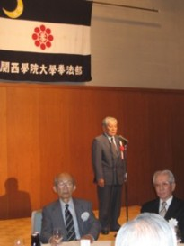 総会は物故者の黙祷から始まり、平成16年度決算、平成17年度予算案が承認され、東京から参加した上野山OBから、6月3日の東京OB会の開催報告がありました。 引き続いて行われた懇親会では、ご来賓に、関西学院大学名誉教授、米田満先生をお迎えし、祝辞を戴きました。米田先生は、「運動部と好きでスポーツを楽しむ 同好会との違いは、運動部はOBと現役が夫々の役割を果たしながら、協力しあって先輩から引き継いだ栄光と伝統を守り、築きあげていくことにある。 現役は全国制覇の栄光を目指して練習に励み、OBは現役が十分活躍出来るように支援する。関学拳法部は長年に亘って栄光と伝統を誇り、一昨年も全国制覇 の実績を挙げている。今後も、現役、OBが協力して是非、全国制覇を達成してほしい。拳法部も部員数が20人では充分でないように思える。各部員が友人を 勧誘して10人増やすように努力してほしい。」と激励して戴きました。歓談の後、4月17日に行われた第9回西日本学生拳法選手権大会のビデオを観賞し、 拳法部歌、校歌を合唱の後、名残を惜しんで解散しました。