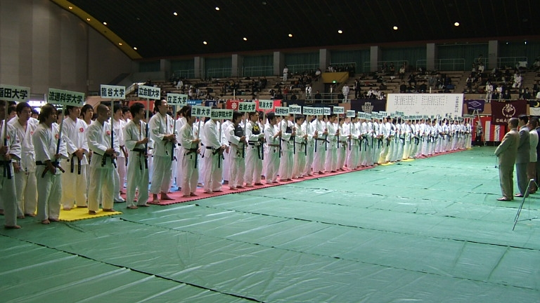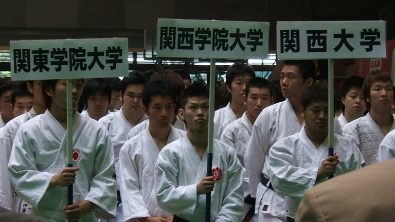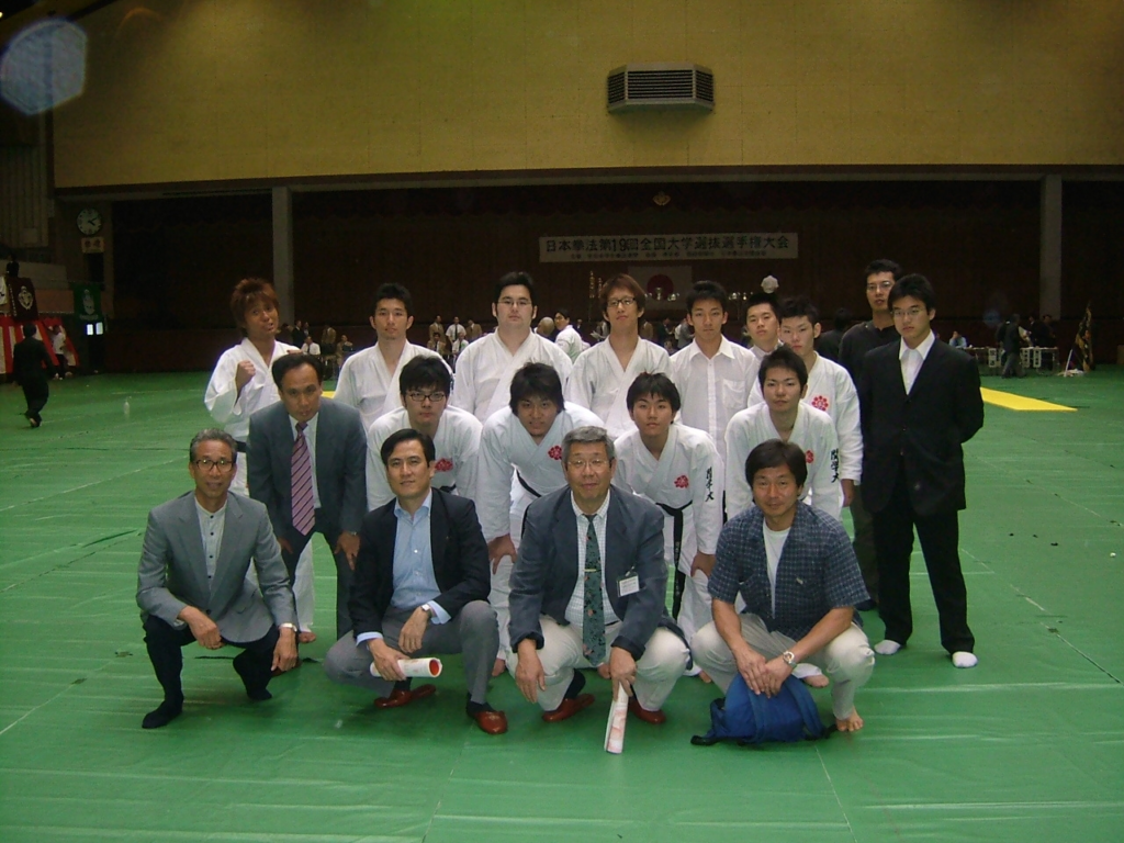 第19回 全国大学選抜選手権大会は45大学が参加して4つのコートに分かれて熱戦が繰り広げられました。 関学は、一回戦はシード、二回戦は、名古屋市立大学に5対0で勝利しました。三回戦の追手門学院大学戦では、先鋒・林三段、次峰・東園三段、 中堅・塚本二段、副将・塩屋二段が勝利し4対1で勝利しました。準々決勝戦は慶応義塾大学を3対2で破り、メンバー全員三段を揃えた 桃山学院大学との対戦になりました。先峰・林三段が順調に勝った後、塩屋二段、塚本二段が桃山学院大の三段二人を続けて破る金星を上げ、 3勝1敗1分でベスト4に進出しました。準決勝戦は龍谷大と対戦し、先峰・塩屋二段が強敵西口三段と引き分け、副将・林三段は福田三段に 勝ち善戦しましたが、1勝3敗1分けで敗退しました。3位決定戦は宿敵関西大学との対戦になりました。副将・林三段は本庄三段に勝ちましたが、 1勝4敗で敗れ、4位となりました。林竜太三段が敢闘賞を受賞しました。本大会には下記のOBが応援に駆けつけました。