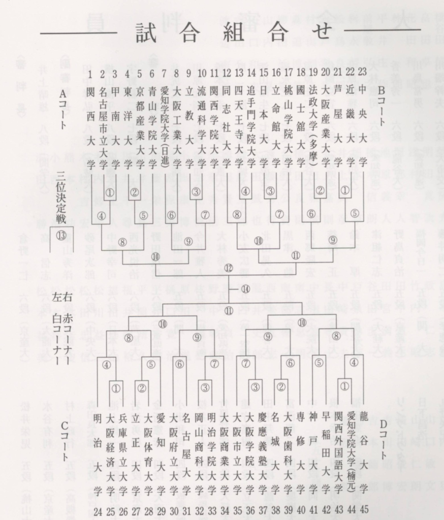 第53回 全日本学生拳法選手権大会は45大学が参加して4つのコートに分かれて熱戦が繰り広げられました。 関学は、一回戦で流通科学大学に7対0で完勝し、二回戦は、四段2名、三段4名を並べた愛知学院大学と戦い、先鋒・山村一級が小池初段、 次峰・桜井三段が梁取四段に勝ち、三峰・枝松初段が原田四段を破る金星を挙げ、中堅・北脇三段、大将・林三段の勝利と合わせて愛知学院大学を5勝1敗1分けで下しました。 三回戦は宿敵関西大学、次峰・北脇三段、副将・桜井三段、大将・林三段が勝ちましたが、惜しくも3勝4敗で破れ、ベスト8に終わりました。
