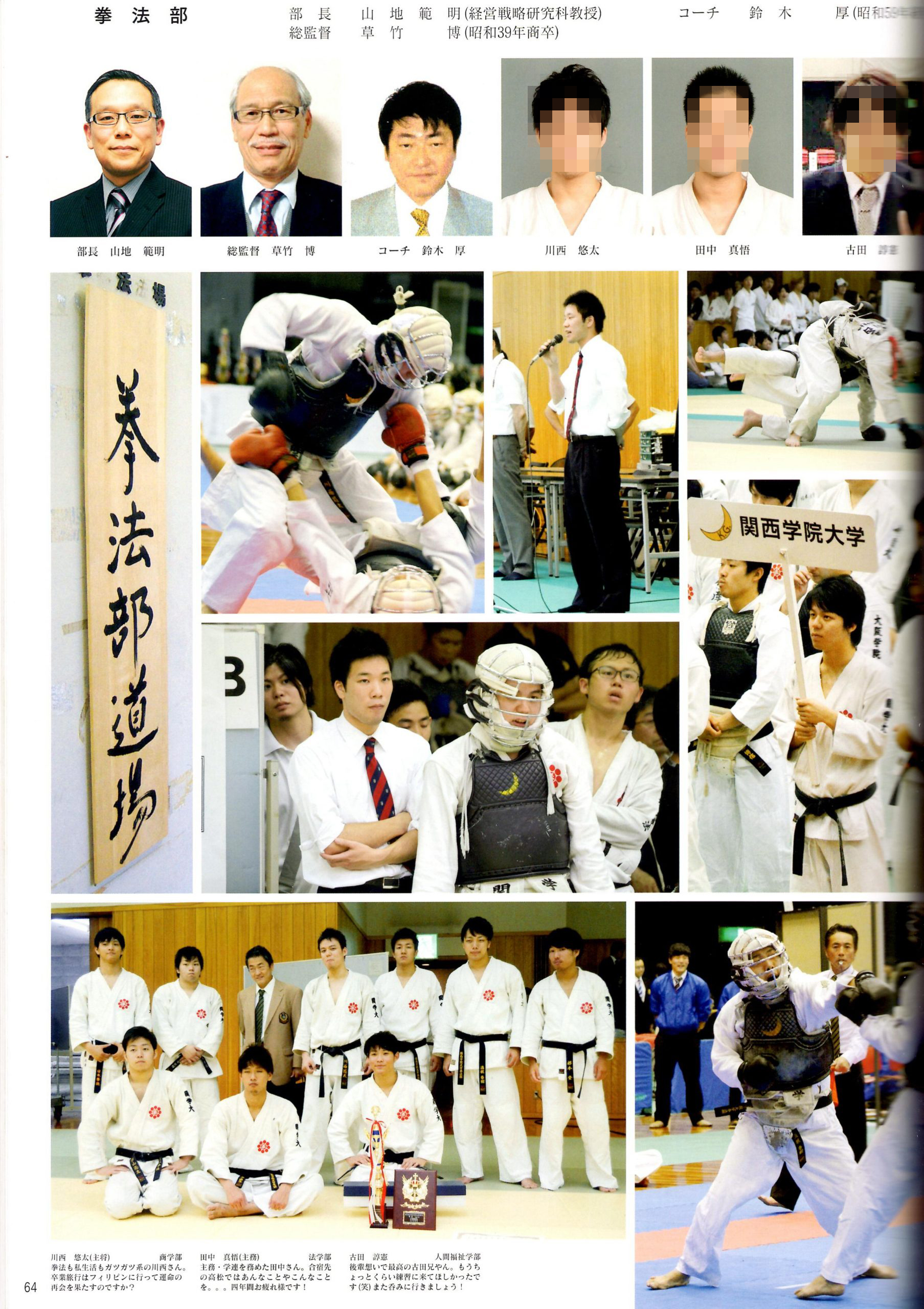 | 6/14 | 第16回西日本学生拳法個人選手権大会 | 吹田市立武道館(洗心館) | 外の部:冨田 ベスト8 弐段の部:島津 ベスト4 参段の部:谷 優勝、宇山 3位 |