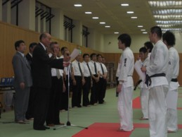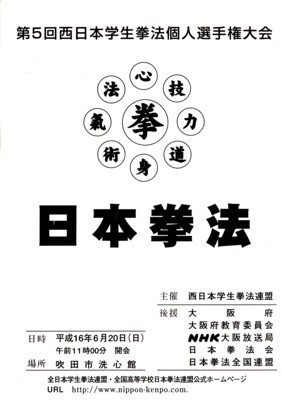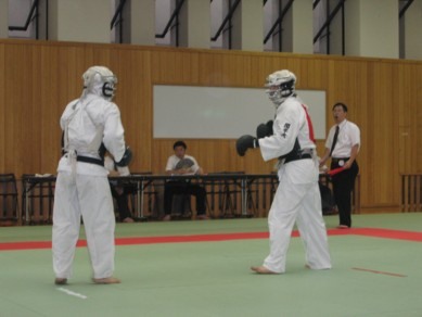 第5回西日本学生拳法個人選手権は155人が参加し、三分間三本勝負で争われました。 関西学院大学拳法部からは、小谷初段、塚本二段、東園三段、藤城四段、大里四段 の5名が参加し、蒸し暑い体育館の中で熱戦が続きました。関学勢では、大里四段がベスト16に入り、藤城四段が3位に入賞しました。優勝は恩地四段(大阪商大)、準優勝は 梅野四段(龍谷大)でした。同時に開催された女子の部では、西村 明日香三段(同志社女子大)、荒堀 絢美三段(関西大学)を含む18名の女子選手が参加し、 熱い戦いが繰り広げられました。